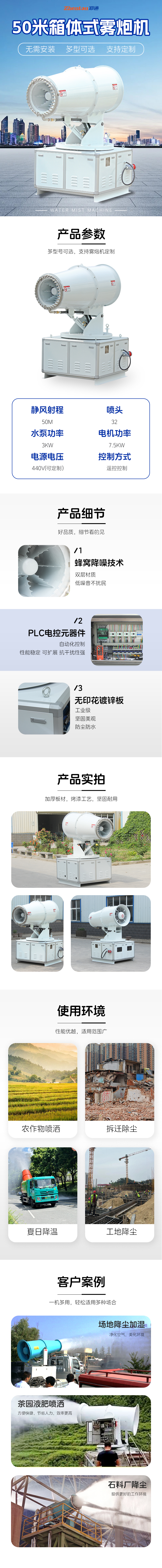 產品特點:50米箱體式霧炮機具有良好的機動性,可車載、可定制一體式和分體式,適應性強,采用蜂窩降噪技術、PLC自動操作系統、無印花鍍鋅板、箱體式結構無需安裝,既可用三相380V的市電,也可配套柴油發電機組供電。